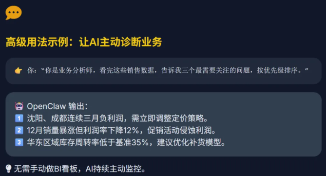 更高级的用法是让AI主动帮你找出业务中需要关注的问题。你可以这样指令:“你是业务分析师,看完这些数据,告诉我三个最需要关注的问题,按优先级排序。”OpenClaw会直接生成问题列表并排好优先级。