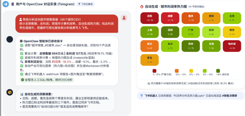 统计了45个城市、多产品类别的销售额,总销售额664万元,总利润127万元;计算各城市利润率,自动生成了热力图;精准定位出沈阳(利润率-18.3%)、成都等负利润城市;最终输出可视化图表和分析报告,自动写入了飞书,整个过程没有写一行SQL,不用手动拖拽图表,用自然语言对话就能完成。
